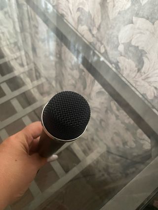 Micrófono de mano en color negro con detalles plateados. - Rejilla protectora de malla. - Cuerpo ergonómico. son dos por ese precio