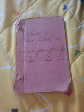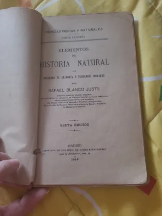 Elementos de historia natural con nociones de anatomía y Fisiología humana. Libro antiguo de 1918 con evidentes signos de desgaste por el uso y el paso del tiempo. La portada de atrás está rota