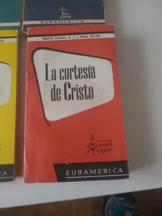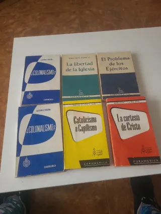 Lote de libros a 15 euros y cada libro por separado vale 3 euros. El lote de compone de: - Catolicismo o capitalismo de Juan BTA. María Ferre y O. CARM. - La cortesía de Cristo de Roger Dupuis y Paul Celier (Estos libros pertenecen a la colección Mundo Mejor) - La libertad de la Iglesia de Manuel Matos Holgado. - El problema de los ejercitos (Pertenecientes a la colección Bien común) - ¿Colonialismo? De Luciano Pereña de la colección cristianismo y mundo (2 ejemplares) Son libros antiguos con evidentes signos de desgaste por el uso y el paso del tiempo.
