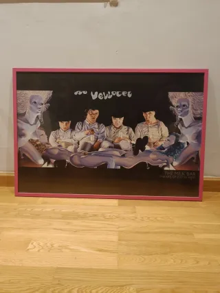 Póster de la película La Naranja Mecánica con un marco rosa. - Ilustración de The Milk Bar por Justin Reed. - Marco de color rosa a medida y cristal. - Tamaño: 94 x 64 cm.