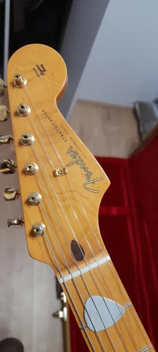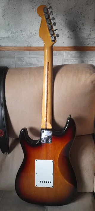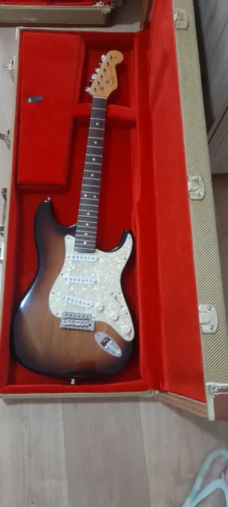 Guitarra eléctrica con acabado sunburst y golpeador nacarado. - Cuerpo de madera con degradado. - Mástil de arce. - Tres pastillas single coil. - Puente cromado.