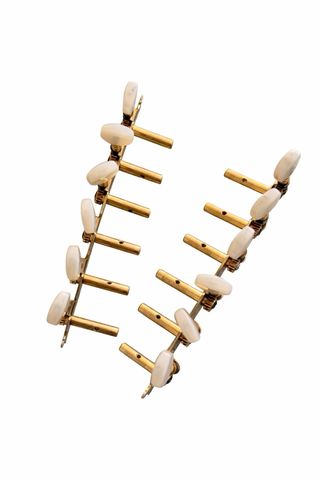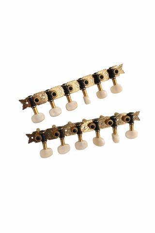 Conjunto de clavijeros para laúd español, con un diseño Fustero y acabado dorado. - Mecanismos de afinación. - Detalle ornamental en la placa. - Botones de nácar.
