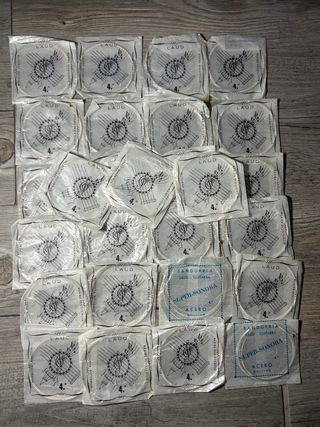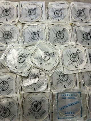Lote de 27 paquetes de cuerdas para laúd. - Cada paquete contiene cuerdas de la 4ª. - Marca: LAUD. - Modelo: SUPER-SONORA. - Material: ACERO. - Tipo: BOLITAS.