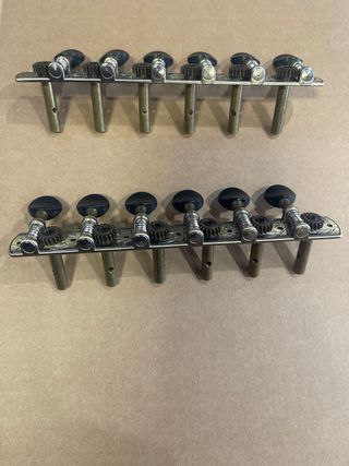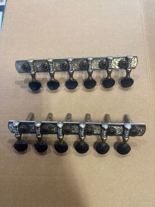 Juego de clavijeros para bandurria o laúd. De la marca Luthier.Diseñados con un acabado metálico y detalles ornamentales. - Incluye dos juegos de clavijeros. - Acabado en color bronce envejecido. - Botones de afinación negros.