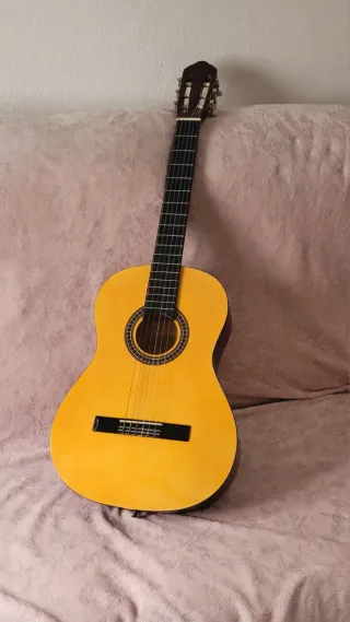 Guitarra clásica de color amarillo. - Cuerpo de madera. - Mástil de madera oscura. - Seis cuerdas.
