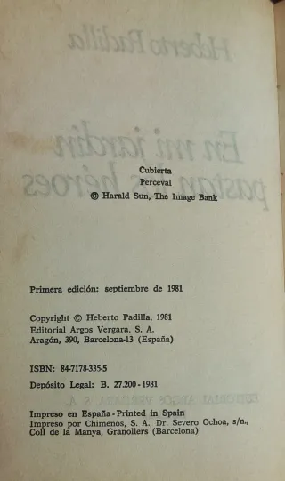 ¡JOYA PROHIBIDA DE LA LITERATURA CUBANA! En mi jardín pastan los héroes – Heberto Padilla Primera edición Argos Vergara, septiembre 1981 (la famosa colección “Las cuatro estaciones – Otoño 1981”). El libro que provocó el mayor escándalo literario de la Revolución Cubana: poemas críticos que llevaron al arresto del autor y al “caso Padilla”. Edición rarísima, censurada casi de inmediato. Tapa blanda (10con roces y pequeños desgarros, interior muy bueno). ISBN: 84-7178-335-5 heberto padilla 1981, caso padilla libro, en mi jardin pastan los heroes, literatura cubana prohibida, primera edicion padilla