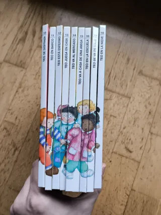 Se venden 9 números de Teo desde el número 10 hasta el número 18, son Teo se disfraza de todo en barco Teo está enfermo Teo juega en casa Teo va al mercado Teo va a casa de una amiga pero en la escuela Teo va de viaje y Teo en la nieve