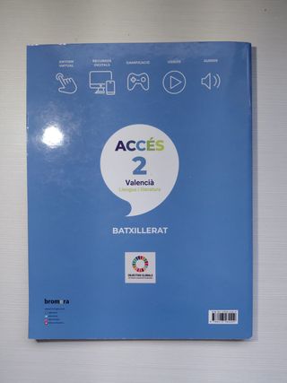 Vendo libro de Valencià: Llengua i literatura para 2o de Batxillerat. Es el método Accés 2 de la editorial Bromera. Estado: Muy bien conservado, con las tapas en buen estado. Contenido: Ideal para preparar la asignatura de Valencià y las pruebas de acceso a la universidad (PAU). Está enfocado en mejorar la competencia lingüística y el estudio de la literatura.
