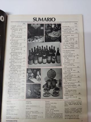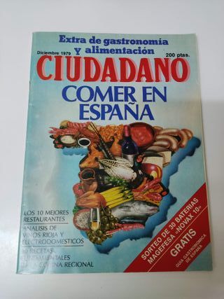 Revista de 130 páginas, Extra de gastronomía y alimentación "Ciudadano Comer en España" Publicada en 1979 por el precio de 200 ptas. Contenido curioso sobre: la historia de la cocina, recorrido por la gastronomía española, vinos, quesos, especias, etc. españolas, Colaboraciones de, por ejemplo, Cándido, Javier Domingo, Victor de la Serna, José Mª Busca Ysusi, etc. etc. En perfecto estado. Regalo del libro de recetas "con la sartén por el mango". Atiendo por teléfono y Whatsapp 607330661. Tengo mas cosas a la venta, gracias por mirar.