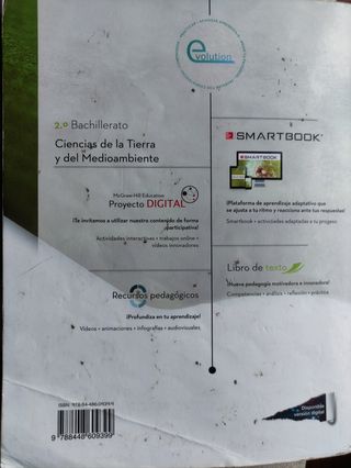 Libro de Texto de la asignatura Ciencias de la Tierra y el Medioambiente, de 2º de Bachillerato. Apenas se ha usado, está como nuevo. Editorial Mc Graw Hill. Incluye Smart Book.