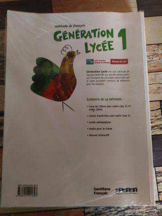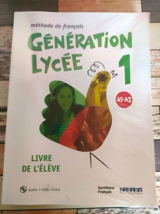 Libro de francés 1 bachillerato santillana (génération lycée) nivel A1-A2. Incluye apuntes y traducciones en las páginas y dos discos en la contraportada.