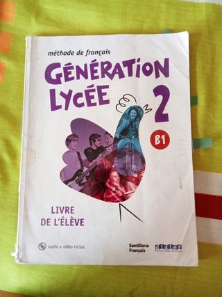 Libro plastificado de francés bachillerato "méthode de français Génération Lycée 1" nivel A1-A2, livre de l'élève. Incluye CD y DVD de audio y vídeo, respectivamente. Editorial Santillana Français. ISBN: 978-84-9049-189-8