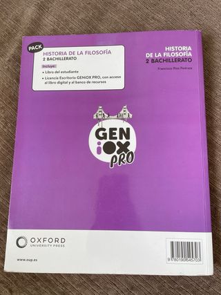 Libro de texto de Historia de la filosofía 2 bachillerato Geniox pro Oxford Isbn 9780190545703 Como nuevo, alguna marca en tapa y esquinas. Solo 24 caras con algún subrayado o apunte de un total de 415 páginas. #44