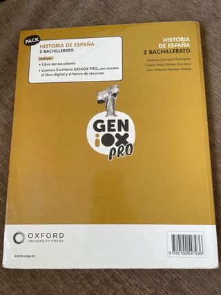 Libro de texto de Historia de España 2 bachillerato Geniox pro Oxford Isbn 9780190547936 Como nuevo, alguna marca en rapas y esquinas, solo 33 caras con algún subrayado, apunte de un total de 391 paginas. #42