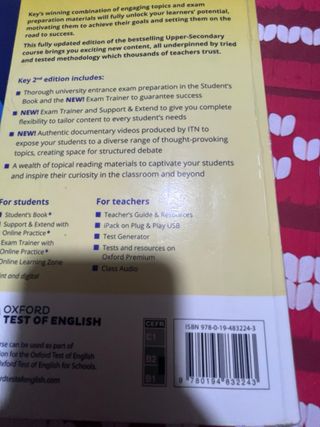 Libros de Inglés de Bachillerato Student's Book y Learning situations and Mediation. ISBN 9780194832588 Y 9780194096683 Incluye Exam preparación for Catalunya 978019483157 NO ESTAN ESCRITOS