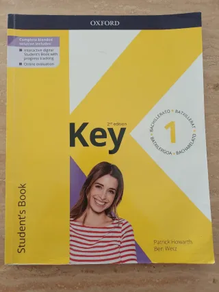 Pack Inglés 1o Bachillerato – Oxford Key (2a ed.) Autores: Patrick Howarth y Ben Wetz · Editorial: Oxford University Press. Estado: óptimo, sin nada escrito. Incluye (3 libros): • Key 1 Student’s Book — ISBN 978-0-19-409669-0 • Key 1 Support & Extend with Online Practice — ISBN 978-0-19-483224-3 • Key 1 Learning Situations and Mediation 1 — ISBN 978-0-19-483256-4 Se vende SOLO el pack completo. Entrega por Wallapop.