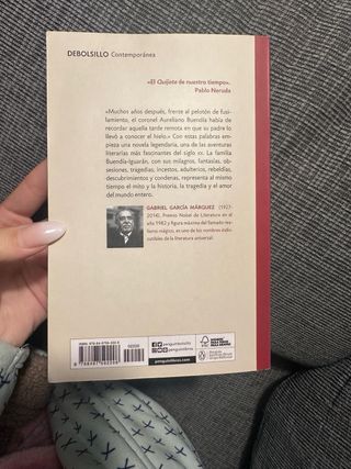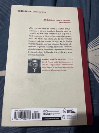 Libro “Cien años de soledad” de Gabriel Garcia Márquez. Está en perfectas condiciones tanto por fuera como por dentro. Como puedes observar en las imágenes, está muy bien conservado y cuidado. Es un libro muy interesante pero lleva su tiempo y dedicación, lo cual supone todo un reto porque es una historia muy diferente a lo que estamos acostumbrados a leer y es una historia clásica.