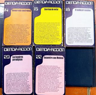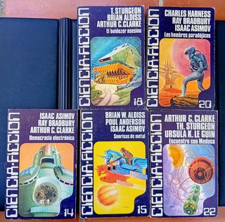 Lote 5 libros Ciencia Ficción: Democracia Electrónica- Asimov, Bradbury, Clarke (Nº 14) Sonrisa de Metal- Aldiss, Anderson, Asimov (Nº 15) El Buldozer Asesino- Sturgeon, Aldiss, Clark (Nº 18) Los Hombres Paradójicos-Harness, Bradbury, Asimov (Nº 20) Encuentra con Medusa- Clarke, Sturgeon, Le Gun (Nº 22)