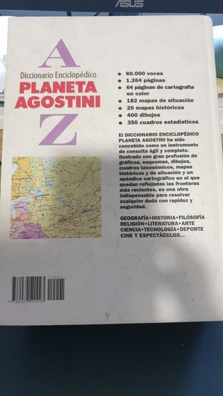 📚 Diccionario Enciclopédico Planeta Agostini (A-Z) Enciclopedia completa y muy visual, ideal para estudiantes y consulta en casa. Más de 60.000 voces y 1.264 páginas, con mapas en color, ilustraciones, cuadros y gráficos. Incluye cartografía, historia, ciencia, arte, literatura, geografía, tecnología… Una obra muy completa para resolver dudas con rapidez. 📖 Interior en buen estado, páginas limpias. 📕 Cubierta con señales normales de uso (ver fotos). Perfecto como herramienta de estudio o referencia.