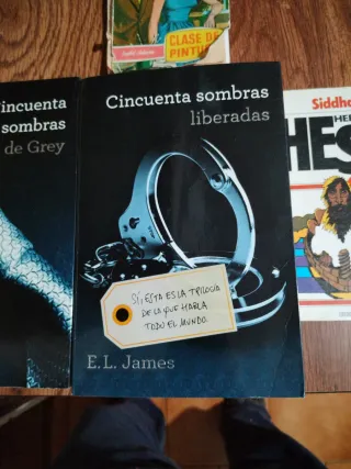 3 tomos , Novela erótica títulos: Cincuenta sombras de Grey , Cincuenta sombras oscuras , Cincuenta sombras liberadas