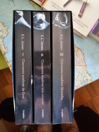 Estuche trilogía "Cincuenta sombras" de E.L. James. Bastante bien conservado. Pequeños defectos en el tomo dos ( se ve en las fotos).