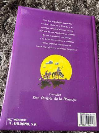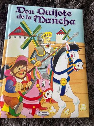 Cuento de Don Quijote de la Mancha . Editorial Saldaña. Fantástico cuento para niños sobre uno de los personajes que marcan la cultura en España . Páginas a color con letras grandes para Lis comienzos de la lectura infantil . Dibujos divertidos . Pasta dura .