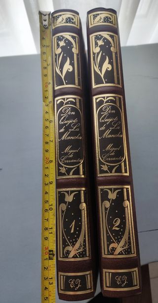 Obra inmortal de Miguel de Cervantes Saavedra: El ingenioso Hidalgo Don Quijote de La Mancha. Dos tomos, con justificación de tiraje 950, encuadernados en pasta dura acolchada, con detalles dorados. Papel envejecido, letra grande. Ediciones Jover, 1988. Edición en exclusiva para Crédito Bibliotecario, limitada a 5.000 ejemplares, hechos artesanalmente a la antigua usanza. Edición anotada por Don N. Diaz de Benjumea. Comentarios de los más eminentes cervantistas e ilustrada por R. Balaca, G. Doré y J.L. Pellicer en blanco y negro y láminas a color. Formato 26x35x5 cm. ISBN 84-7093-322-1 Tomo I, 570 pág Tomo II, 652 pág. Sin estrenar
