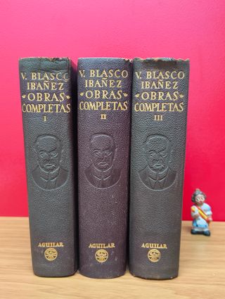 Edición de 1949 publicada por Aguilar, encuadernada en piel gofrada con retrato del autor grabado en el lomo y letras doradas. Los tres volúmenes incluyen una completa nota biobibliográfica y retratos del escritor, además de guardas ilustradas con escenas mediterráneas y cortes decorados con elaborados motivos geométricos en azul y crema. Esta edición de lujo reúne las grandes novelas, ensayos y crónicas de viajes del autor valenciano, reflejo de su vida aventurera y su espíritu republicano. Un conjunto monumental, símbolo de la colección Aguilar y pieza clave para los amantes de la literatura española y la encuadernación artística.