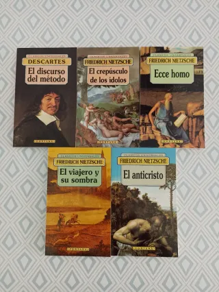Colección libros filosofía: Descartes: El discurso del método Nietzsche: El anticristo El viajero y su sombra Ecce homo El crepúsculo de los ídolos Los libros están en perfectas condiciones. Alguno amarillea algo por el tiempo, pero poca cosa.