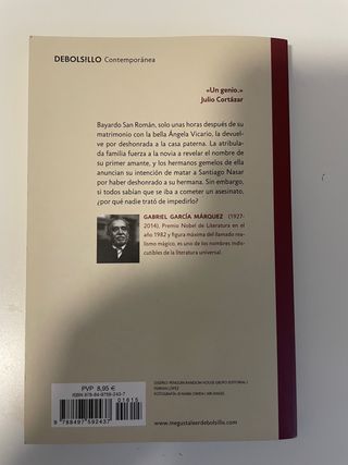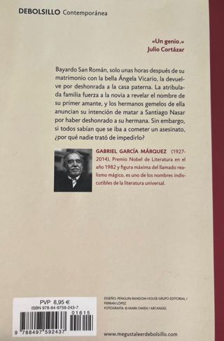 Tapa dura. La sobrecubierta está algo gastada, pero el resto del libro está en perfectas condiciones. El día en que lo iban a matar, Santiago Nasar se levantó a las 5.30 de la mañana para esperar el buque en que llegaba el obispo». Cuando empieza la novela, ya se sabe que los hermanos Vicario van a matar a Santiago Nasar -de hecho, ya le han matado- para vengar el honor ultrajado de su hermana Ángela, pero el relato termina precisamente en el momento en que Santiago Nasar muere. En mi perfil encontrarás muchos más libros, si te interesan varios, contáctame. Unificamos el envío. Hago descuentos para packs.