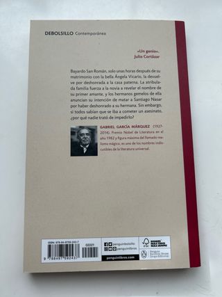 GABRIEL GARCÍA MÁRQUEZ 📍 Entrega en mano en Metro Iglesia 📦 Hacemos envíos con Wallapop Una novela breve e impecable donde todo se sabe desde el principio… y aun así es imposible dejar de leer. García Márquez reconstruye un crimen anunciado con una precisión milimétrica, mezclando fatalismo, memoria colectiva y el pulso inconfundible del realismo mágico. 🏷️ Editorial: Debolsillo 🔢 ISBN: 9788497592437 📘 Estado: Bueno ✏️🚫 Sin anotaciones en sus hojas ❌ No está subrayado Gracias, pero no atendemos propuestas de precio.