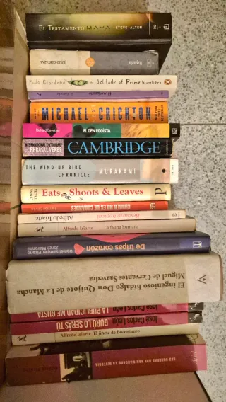 La guerra civil española – Antony Beevor La metamorfosis y otros relatos – Franz Kafka Repertorio prohibido – Alfredo Iriarte La vida de Lazarillo de Tormes (Anónimo) El monje que vendió su Ferrari – Robin Sharma Merde Actually – Stephen Clarke Narcoextravagancia – Óscar Escamilla Demian – Hermann Hesse Diccionario Pocket: Portugués-Español El curioso incidente del perro a medianoche – Mark Haddon Ángeles y demonios – Dan Brown Tokio Blues (Norwegian Wood) – Haruki Murakami Life of Pi (La vida de Pi) – Yann Martel De qué hablo cuando hablo de correr – Haruki Murakami Crónica de una muerte anunciada – Gabriel García Má