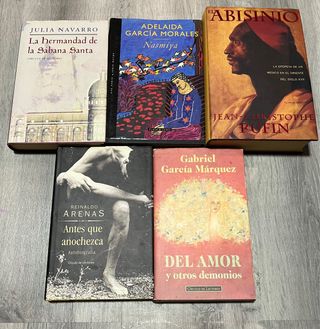 "El abisinio" - Jean-Christophe Rufin "Del amor y otros demonios" - Gabriel García Márquez "Nasmiya" - Adelaida García Morales "La hermandad de la sábana santa" - Julia Navarro "Antes que anochezca" - Reinaldo Arenas Se nota el paso del tiempo en los 5 libros.