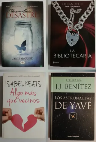 Libros 3€ unidad. No hago envíos, se entrega en mano en Alcorcón. - Maravilloso desastre (Tapa blanda) Autor: Jaime MacGuire Editorial: Suma - La bibliotecaria (Tapa blanda) Autor: Logan Belle Editorial: Esencia - Algo más que vecinos (Tapa blanda) Isabel Keats - Los astronautas de Yavé (Tapa dura) J. J. Benítez Más libros, cómics, cuentos, revistas, autoayuda, Psicología, manuales, medicina, novelas, cocina, política, humor, religión, tebeos, Botánica, lotes, ofertas, CDs, DVDs, VHS, cassettes y variedad de artículos en mi perfil.