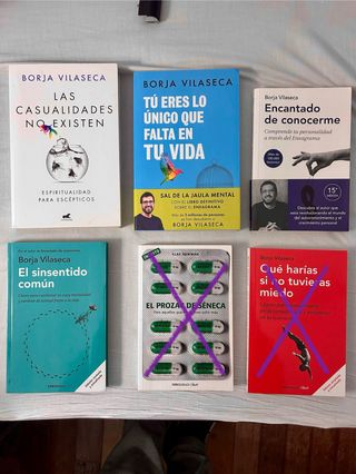 Pack 4 Libros de Autoayuda de Borja Vilaseca El Prozac de Seneca y Que harías si no tuvieras miedo ... ya no están disponibles. Precio por todo el pack. Sueltos consultar o mirar los otros packs de mi perfil. El sinsentido común contiene 4 paginas subrayadas. Contienen motas amarillas (oxidación de la lignina) pero se dejan leer. Cualquier duda consultar antes de comprar. Abrazo