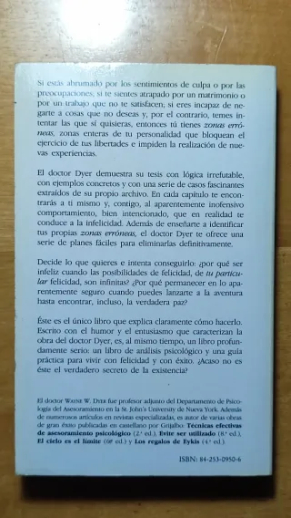 Tus zonas erróneas" es un libro de autoayuda de Wayne Dyer que identifica y ofrece soluciones para patrones de pensamiento y comportamiento autodestructivos que impiden la felicidad, como la culpa, la inseguridad y la necesidad de aprobación, proponiendo un camino hacia la autorrealización y la responsabilidad personal. Lo forré para protegerlo y el celo ha dejado marca en las hojas de cortesía.. ¡Ley de Murphy! El interior está bien. Las orillas de la página amarillean por el paso del tiempo, aunque inicialmente el papel ya era ahuesado.
