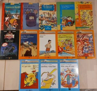 Tapa blanda, bien conservados, con alguna marca por el uso. 9 libros en catalán: -De 7 anys, "Ai, que caic!"i"Jasolina, vista fina". -De 9 anys, "El vaixell fantasma","Qui ha segrestat el Faraó?","Oriol"i"El segrest d'en Gang". -De 12 anys, "Operació París","La pedra màgica"i"El doctor Guineu". 4 Libros en castellano: -De 7 años, "Mini, ama de casa". -De 9 años, "Escenarios fantásticos". -De 10 años, "La conferencia de los animales". -De 12 años, "Los trapos sucios, Manolito Gafotas". - PRECIO por cada libro 3€ - ENVÍOS a partir de 6€ (compra mínima para envíos 2 libros) - LOTE por los 13 libros a 30€