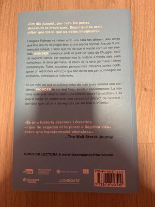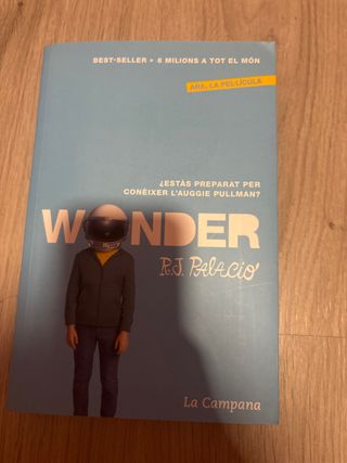 Novel·la juvenil "Wonder", escrita per R.J. Palacio. Un fenomen mundial que ha emocionat a milions de lectors. Sinopsi: "Em dic August, per cert. No penso descriure la meva cara. Segur que és molt pitjor que tot el que us esteu imaginant.". L'Auggie ha nascut amb una deformitat facial severa i, després d'anar d'hospital en hospital, per primera vegada anirà a una escola normal. Una lliçó de vida, amistat i coratge. Editorial: La Campana. Idioma: Català / Catalán. ISBN: 978-84-96735-71-2. Estat: En bon estat (tapa tova amb solapes). #llibres #wonder #rjpalacio #lacampana #lecturaobligatoria #catala #juvenil #bestseller #augustp