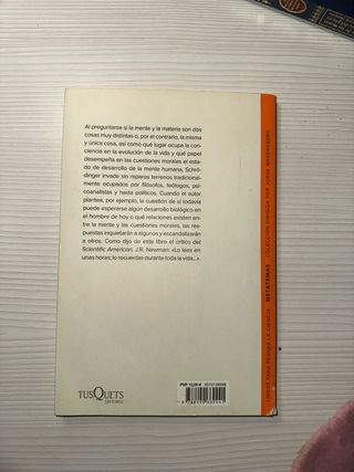 Una reflexión multidisciplinar sobre la mente y la materia por uno de los científicos más importantes de todos los tiempos. Al preguntarse si la mente y la materia (el sujeto y el objeto, el yo y el mundo exterior, etcétera) son dos cosas distintas o, por el contrario, la misma, así como qué lugar ocupa la conciencia en la evolución de la vida y qué papel desempeña en las cuestiones morales. Schrödinger invade sin reparos terrenos tradicionalmente dominados por filósofos, teólogos, psicoanalistas y hasta políticos. las respuestas inquietarán a algunos y escandalizaran a otros. Tiene una pequeña peladura Valorado en 13€
