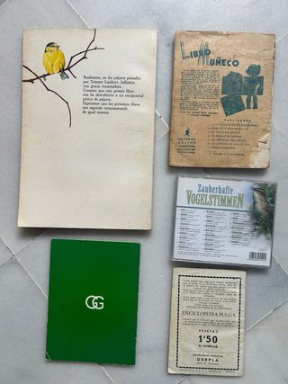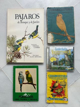 Lote compuesto por cuatro libros y un CD. El precio para el lote completo es de 19E. Si desea alguna unidad suelta, el precio es de 5E. - Pajaros de bosque y jardín. P. 540 Gr. - Canaricultura. El Canario su cria y enfermedades. Primera edición Febrero 1947. P. 325 Gr. - Periquitos, loros, palomas y tórtolas. P. 200 Gr. - Canaricultura. Alimentación, jaulas, incubacion, apareamiento, colorido, etc. P. 220 Gr. - CD Magicos sonidos de pajaros. El título del CD es voces de pájaros encantadoras. El CD incluye un folleto con un extenso léxico de aves. P. 150 Gr. Peso del lote 1300 Gr REF-CDCA7D (CADEMD)