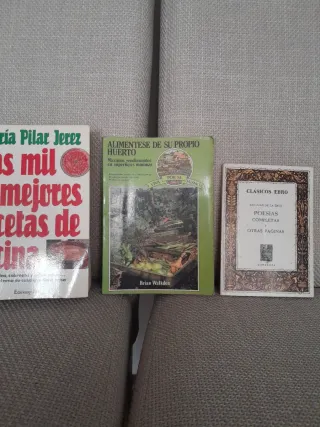 Lote de tres libros, antiguos. Las mil mejores recetas de cocina, María Pilar Jerez, Alimentese de su propio huerto, viva por sí mismo, Brian Walkden, Poesías completas y otras páginas, San Juan de la Cruz, clásicos Ebro, Zaragoza. Tres libros,, de recetas,sobre la huerta, y poesías.