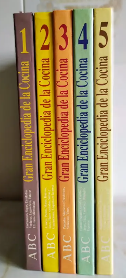 Gran Enciclopedia de la Cocina Tradicional Española de ABC. Enciclopedia: Obra completa formada por 5 tomos de fasciculos ya encuadernados en tapa dura, repletos de recetas de la Academia de la Cocina Española. Prensa Española ABC. EDITORIAL: Ediciones Nobel S.A. Impresión: Altamira Industrias Gráficas AÑO: 1993 Muy buen estado, nuevo, profusamente ilustrado con fotografías a color (muchas a plena página) de los platos propuestos. Cantoné. Cada libro PÁGS: 384 DIMENSIONES: 28,7 x 21,5 cms. PESO: 1011 grs.
