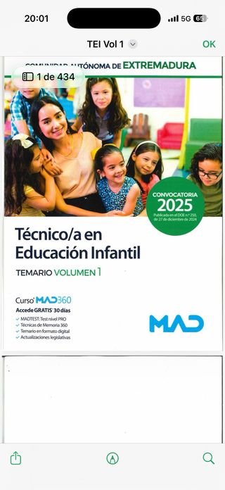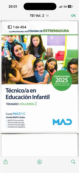 Vendo temario Técnico Educación Infantil Extremadura de 2025 completamente actualizado de editorial Mad. Incluye Volumen I, Volumen II, test y supuestos prácticos Se venden por separado o juntos