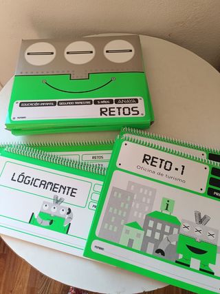Método de educación infantil editorial Anaya retos solo tiene carpeta un trimestre aunque está el material de los demás trimestres. Hay alguna cosa que falta como la revista de trazos se puede utilizar para reforzar en casa