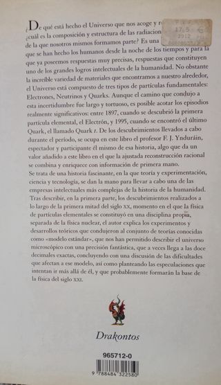 Electrones, Neutrinos y Quarks. F.J. Ynduraín. La física de partículas ante el nuevo milenio. Editorial Critica, colección Drakontos 2001, 268 págs. Tapas duras con sobrecubierta. Libro como nuevo, en perfecto estado, mínima suciedad en sobrecubierta, inetrior excelente, hojas limpias sin anotaciones, firma ni exlibris... vea las múltiples fotos Vista mi perfil. Libros de ciencia, divulgación, física, cuántica, relatividad, partículas... se juntan lotes para envio.