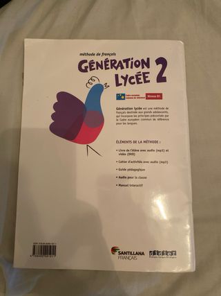 Libro méthode de français, Génération Lycée 2 (B1) para la asignatura de Francés de 1º y 2º de Bachillerato. En buen estado. No incluye el DVD. ISBN: 978-84-9049-190-4.