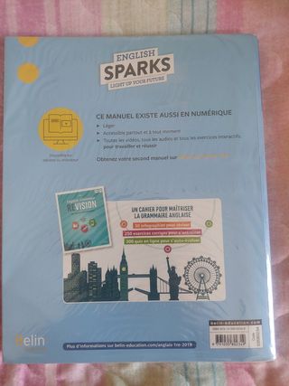 Libro de texto en francés para estudiar inglés hasta un nivel B2 de la coleccion Belin:Éducation. A penas usado, está nuevo.