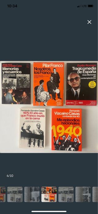 Lote 4 libros de la Colección Espejo en buenas condiciones años 80. Son: 1.- Nosotros, los Franco... Número 62 Primera Edición: octubre de 1980 ISBN: 8432056626 2.- Tragicomedia de España Número 10 Primera Edición: Marzo de 1985 ISBN: 8432058335 3.- 1975 El año en que Franco murió en la cama. Número 155 Primera Edición:octubre de 1982 ISBN: 840800130-2 4.- Mis Episodios Nacionales Número 85 Primera Edición: mayo de 1983 ISBN: 8432056855 Vendo sueltos a 4€ Lote a 15€ Memorias y Recuerdos: Vendido