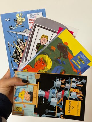 5 libros en francés leídos una vez en el instituto 1. Ça démenage! - Philippe Barbeau 2. Enquête très postume - Gérard Hubert-Richou 3. Grosse Peur dans l’ascenseur - Ségolène Valente 4. Mes pires Vacances siper chouettes - Christophe Miraucourt 5. Le petit prisonnier - Jean Marc Pitte Alguno tiene palabras con la traducción al español en lapiz Cada libro por separado 3€