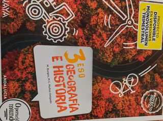 Libro de Geografía de 3°ESO, Editorial SANTILLANA GRAZALEMA (Andalucía), Serie DESCUBRE, Proyecto SABER HACER. ISBN 978-84-9132-559-8. Incluye el Atlas de Geografía y el cuadernillo de lo imprescindible. Está en buen estado y forrado, pero tiene algunas anotaciones.